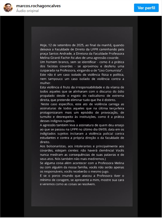 “Aos bolsonaristas, aos intolerantes e principalmente aos covardes, estejam cientes: não haverá demência! […] Se alguma coisa além acontecer com a professora Melina ou com alguém da nossa família, vocês não serão apenas os responsáveis, vocês receberão o mesmo jugo…”, afirmou o esposo da vítima.